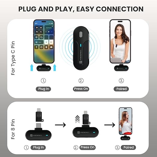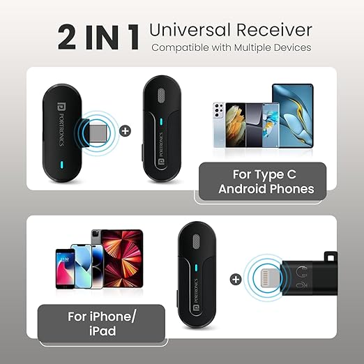 - Universal Compatibility : The newly launched wireless lavalier mic by Portronics connects seamlessly to a wide range of devices, including smartphones thanks to our Type C and 8 pin receiver.
