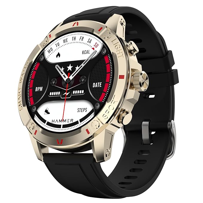 HAMMER Luxor 1.45" AMOLED Display Round Dial Smart Watch with BT Calling, 100+ Sports Modes, Always on Display, Health Tracking, Music Control (Gold)