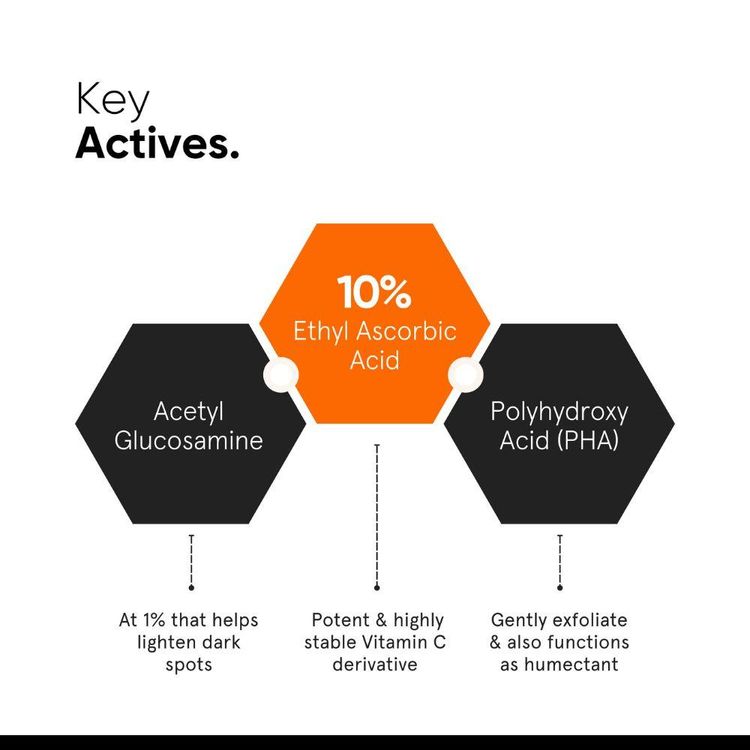 A glow-boosting daily serum packaged with the goodness of Vitamin C & Polyhydroxy Acid (PHA) that brightens and tones sun damaged and dull skin with dark spots. Made with stabilized Vitamin C derivative "Ethyl Ascorbic Acid" that has 86% pure Vitamin C content. That is much higher than 40-50% content present in other Vitamin C derivatives. At a pH of 4.0 it is highly stable and effective.