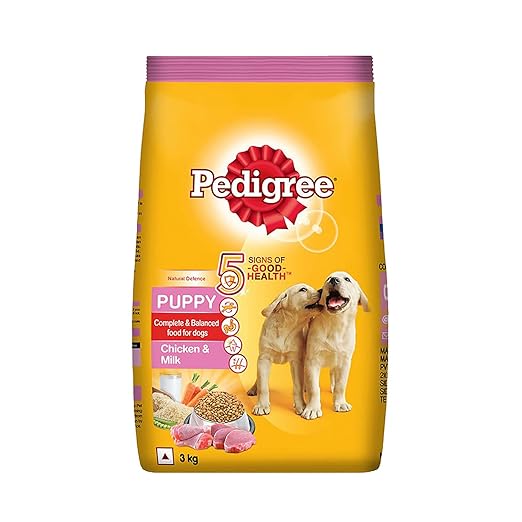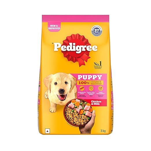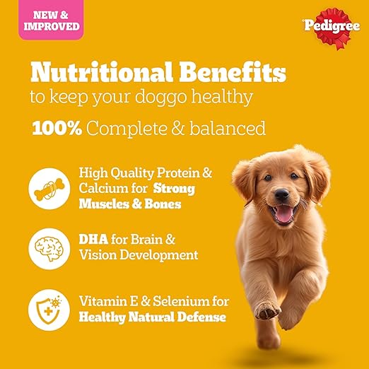 • Pedigree Puppy Dry Dog Food contains minimum 24% crude protein from quality sources like chicken, min 10% crude fat, and max 5% fibre.