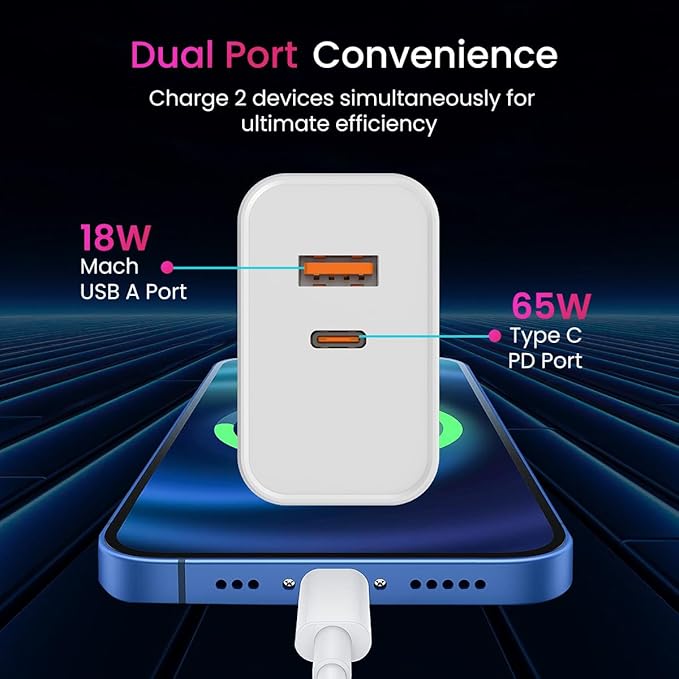 • Adapto 65 Pro : Mach USB and Type C Adapter wall charger with Double Output Ports (1 USB + 1 PD)| Fast Charging with PPS Technology. This GaN Charger has fast-charging capabilities and can charge devices up to three times faster than traditional chargers.