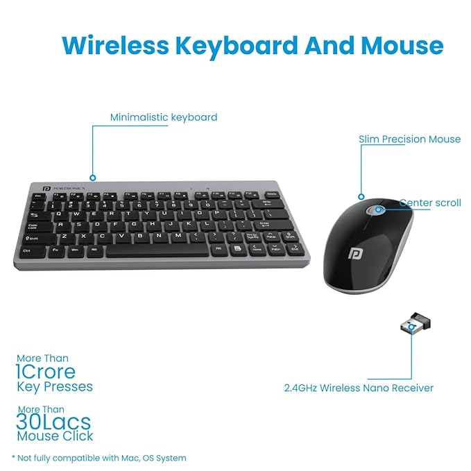 Portronics Key2 Combo Wireless Keyboard and Mouse Set, with 2.4 GHz USB Receiver, Silent Keystrokes, 1200 DPI Optical Tracking, Compact Design, Multimedia Keys for PC, Laptop & USB Supported Devices (Grey)
