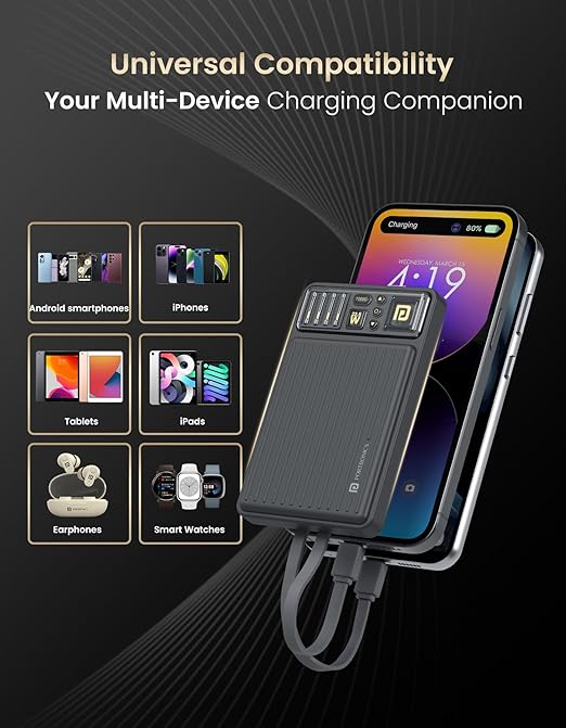 - 22.5W Portable Power Bank with Built-in Cables: Ditch the cables with this featherlight and small size power bank. This battery pack has 2 built-in cables- Type C cable and 8-pin cable. Directly plug your device into the power pack of 10,000mAh.