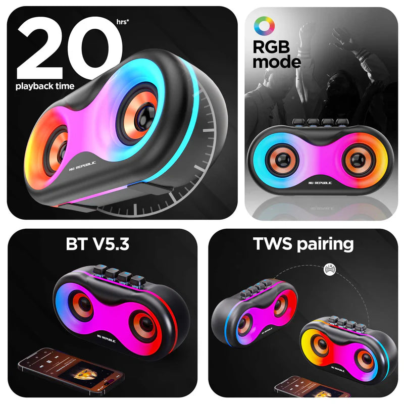 Indulge in the captivating sound of the Nu Republic Sonicpop 160 Bluetooth Speaker, boasting a powerful 16W RMS output and enhanced by X-Bass technology. With a sleek design and various RGB modes, this speaker is sure to turn heads and provide an immersive listening experience. Enjoy up to 20 hours of playtime and take advantage of the TWS pairing feature for unforgettable house parties. This portable speaker offers multiple connectivity options and is splash-resistant, making it the perfect travel companion for music enthusiasts on the go.
